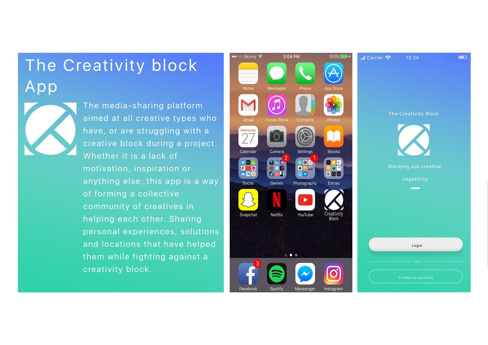 This was my University final major project, in which I created an app to help with creative blocks, taking inspiration from Pinterest and other social media platforms, people can help each other get out of that slump with ideas for work and locations to visit.