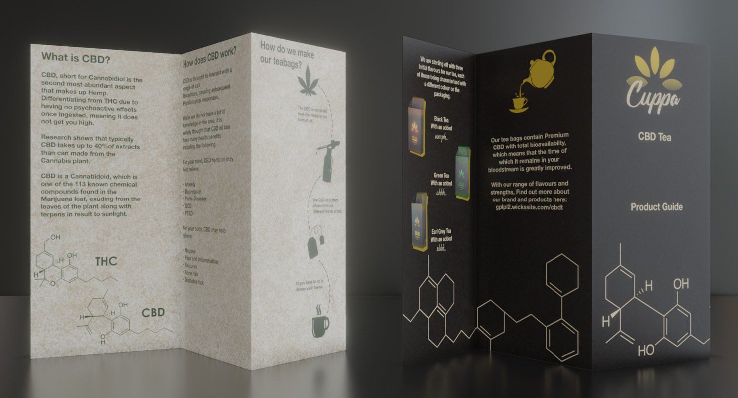 This project was the branding of a CBD tea brand in which I created and called 'CUPPA', here shows the renders of the leaflet and packaging.